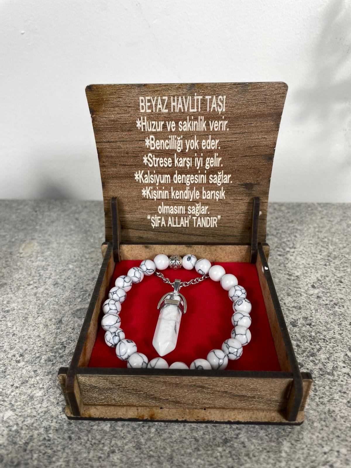 Beyaz Havlit Doğal Taş Kolye & Bileklik Seti – Özel Ahşap Kutulu