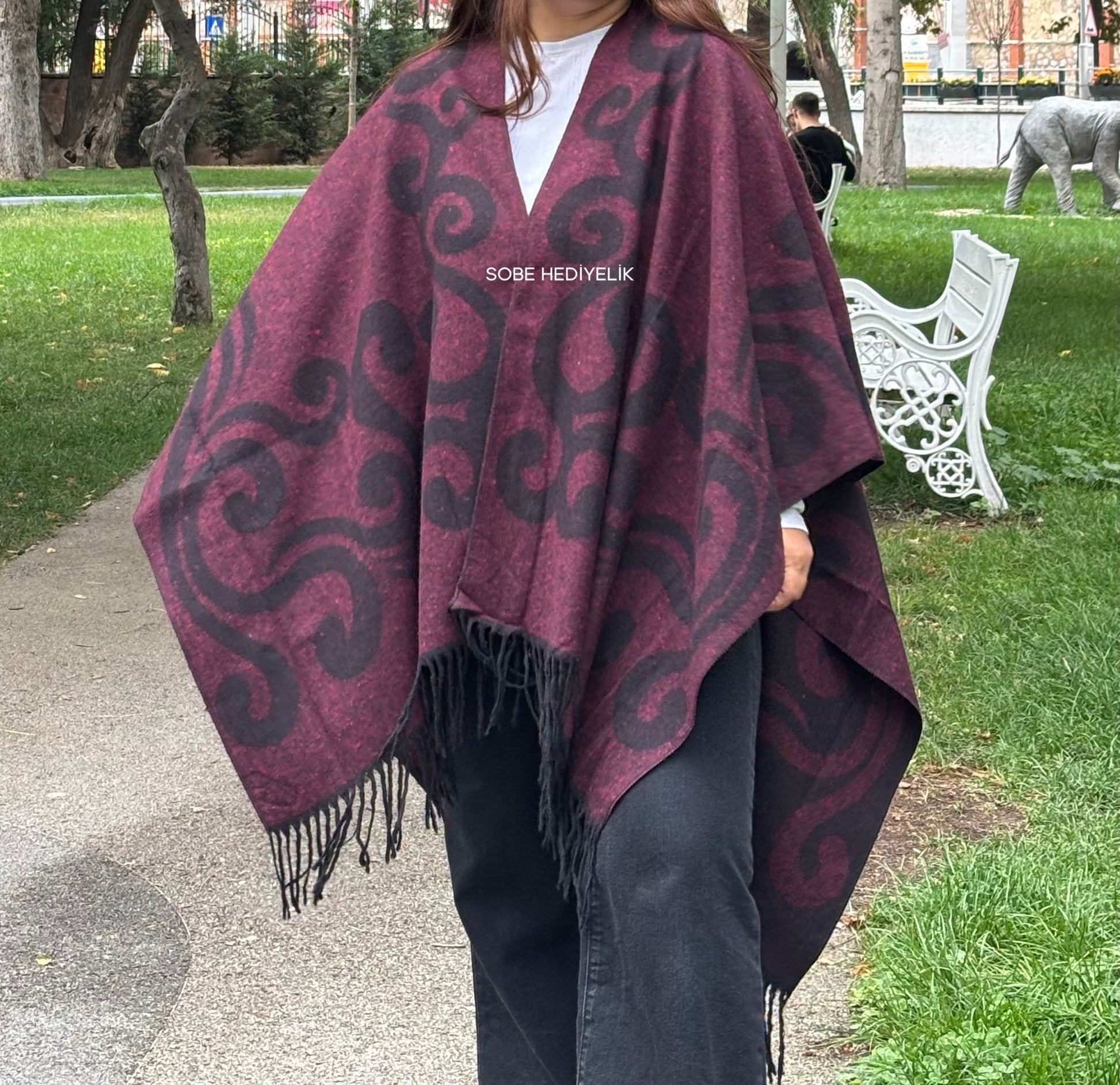 Bordo Çift Taraflı Yünlü Desenli Kadın Panço