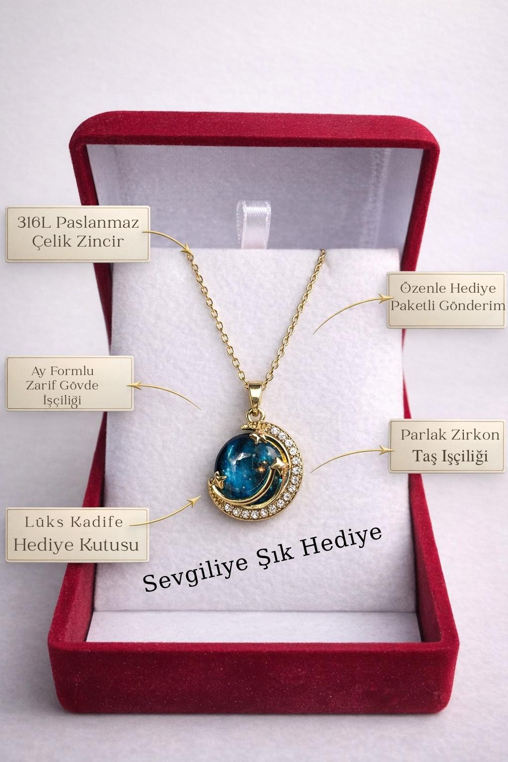 Çelik Ay Kolye – Kadife Kutulu Kadın Kolye