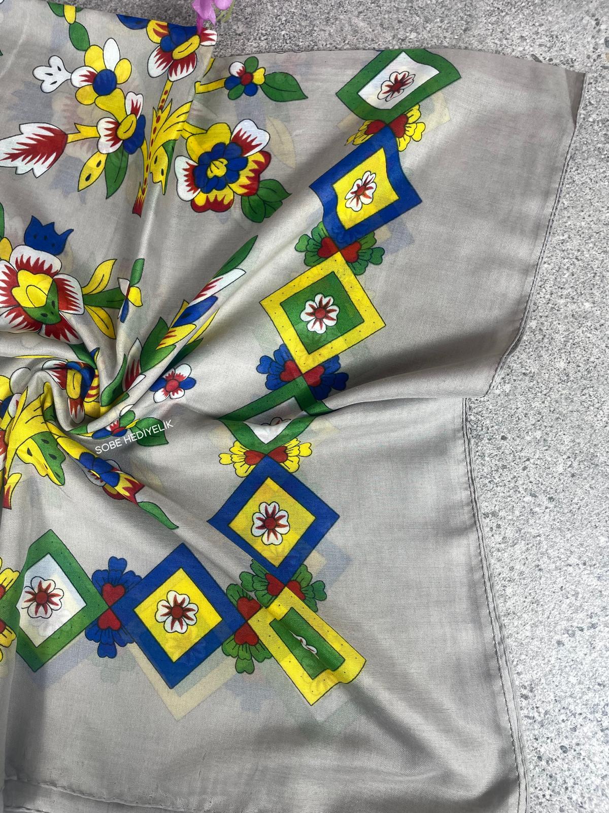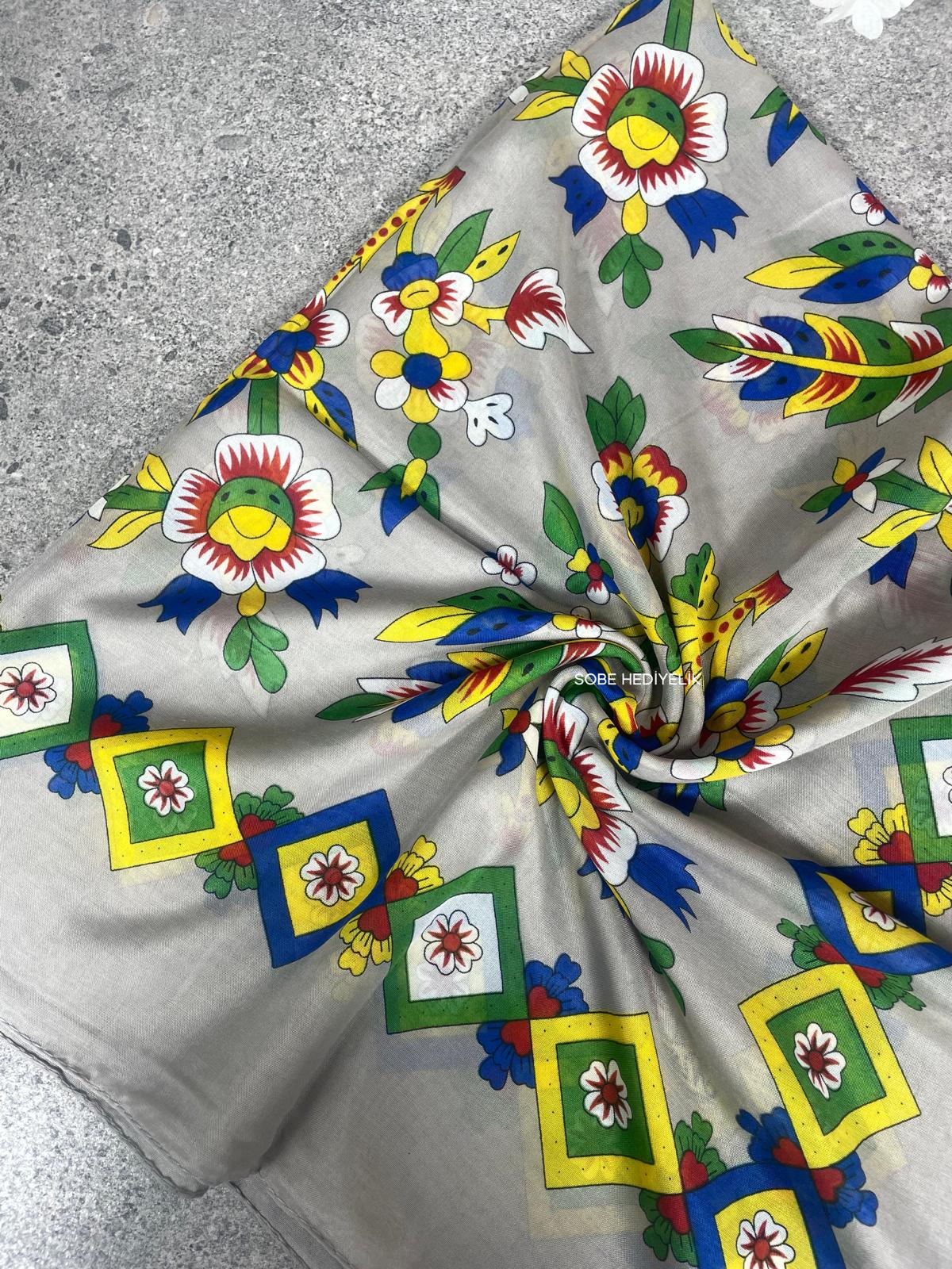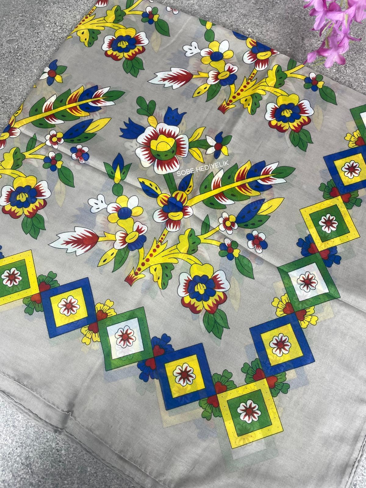Krem zemin üzerindeki Çengelköy çiçek ve kare motifleri ile canlı, yöresel ve modern bir görünüm sunar.