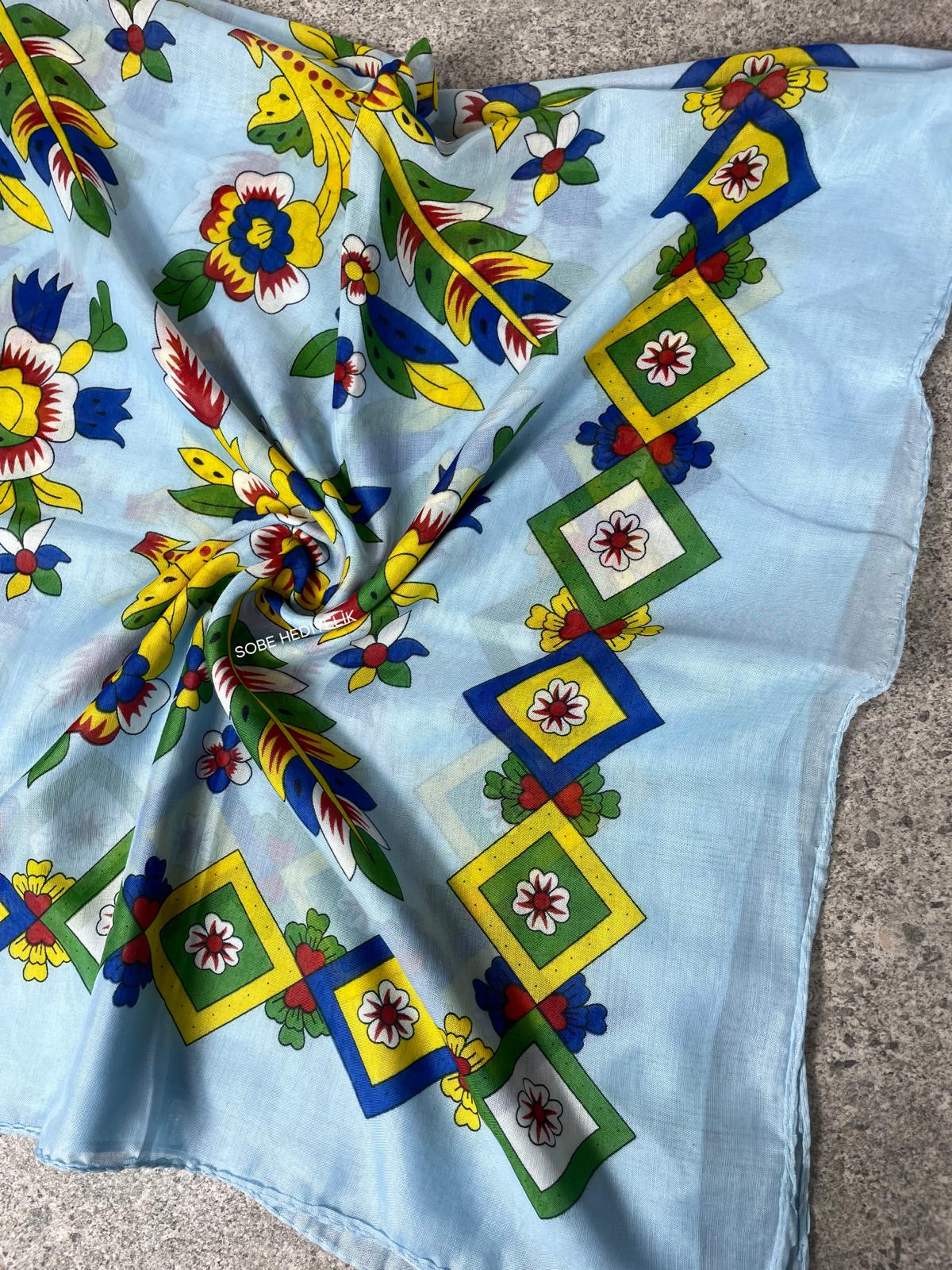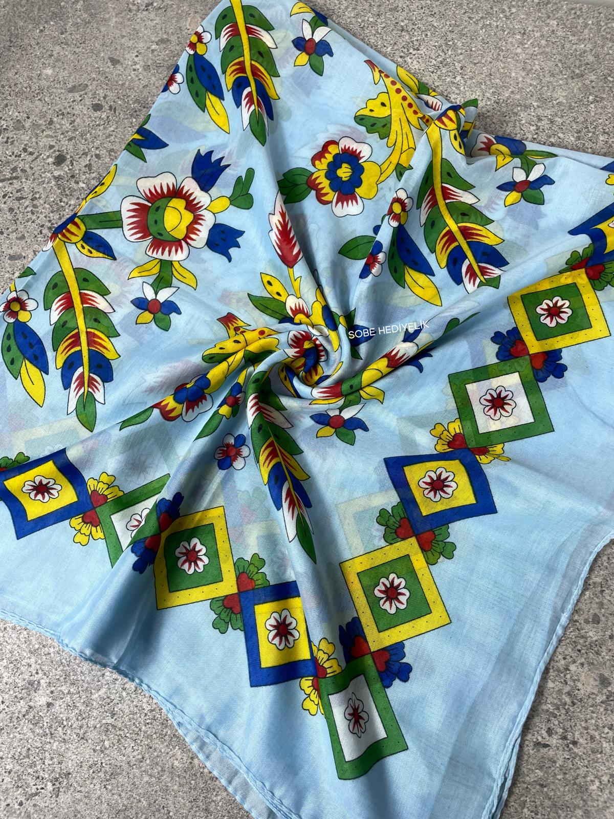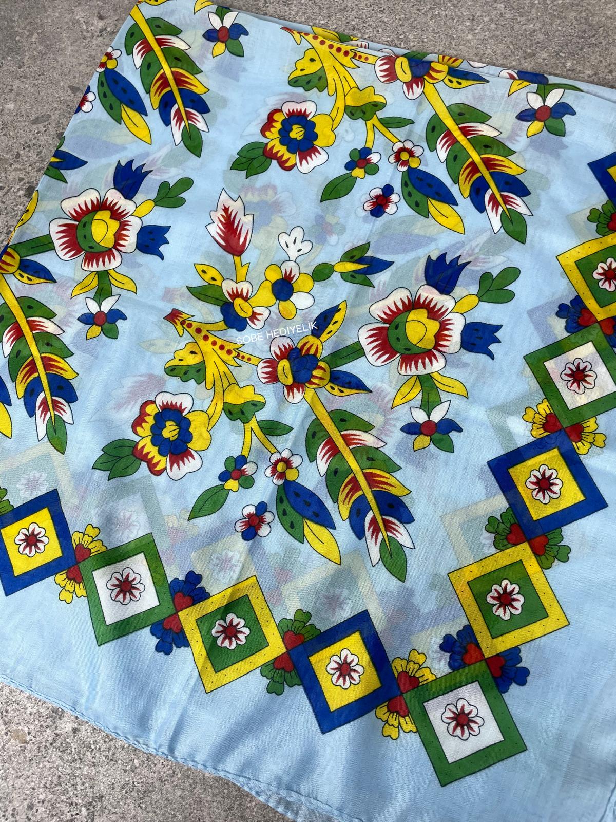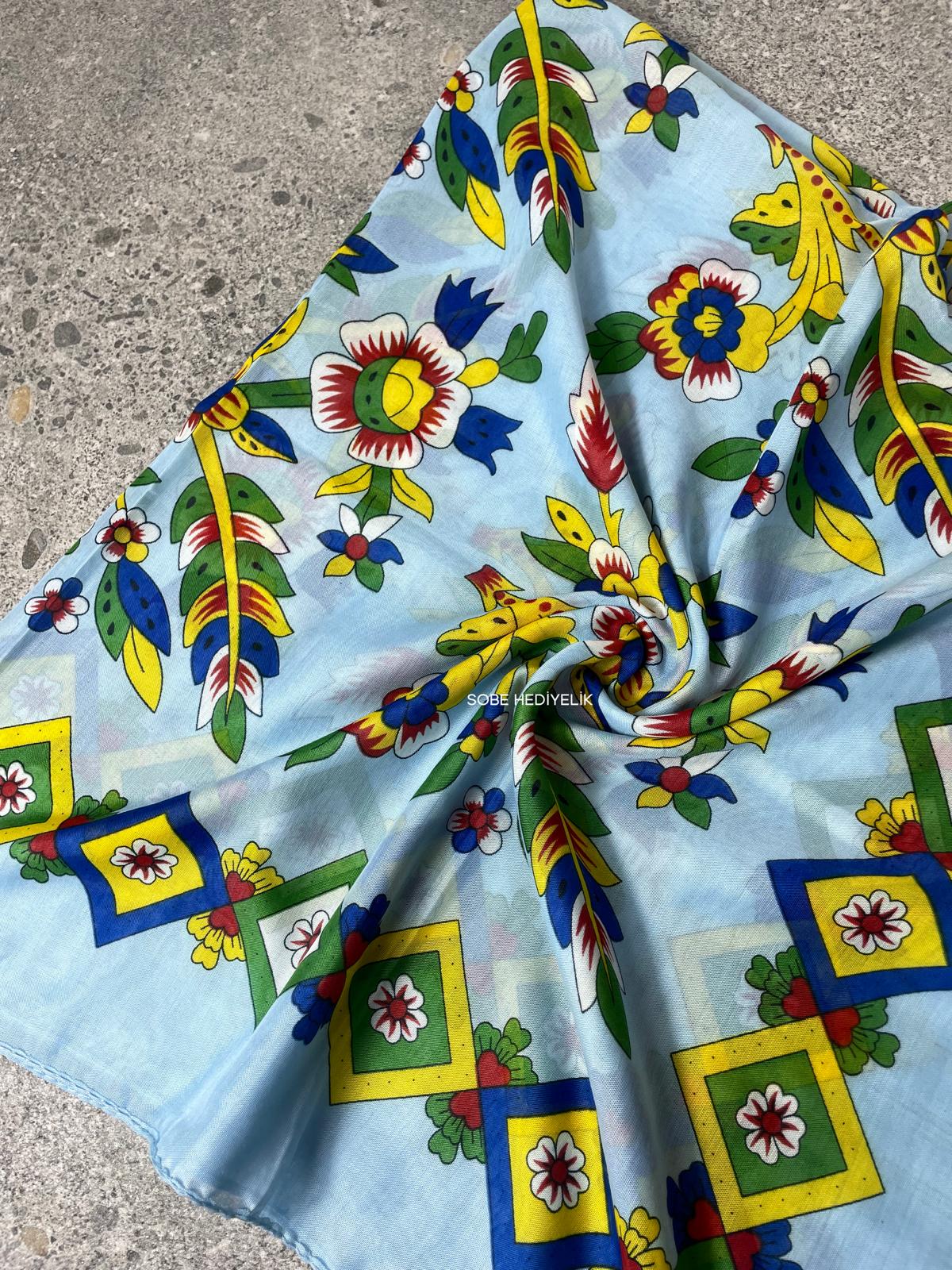 Mavi zemin üzerindeki Çengelköy çiçek ve kare motifleri ile canlı, yöresel ve modern bir görünüm sunar.