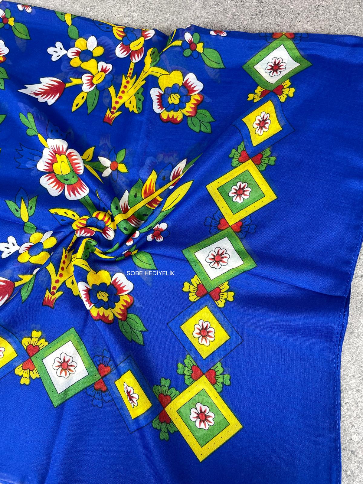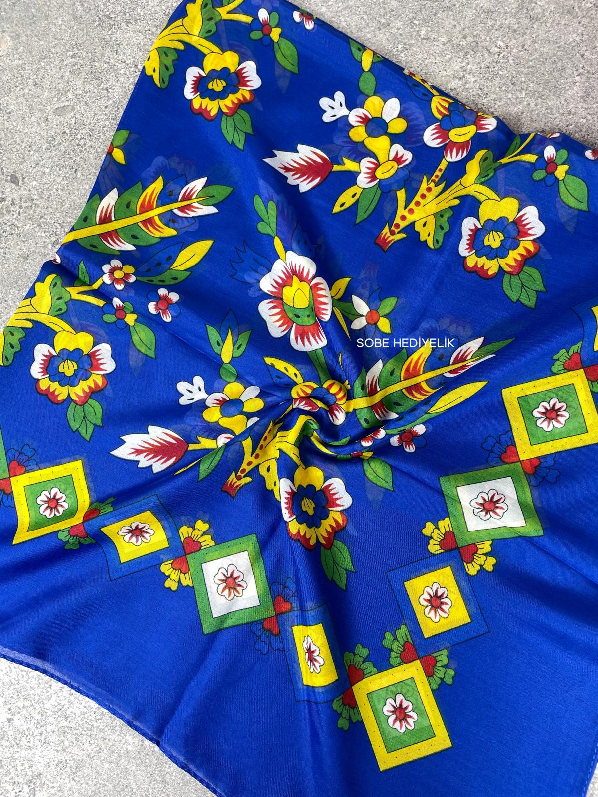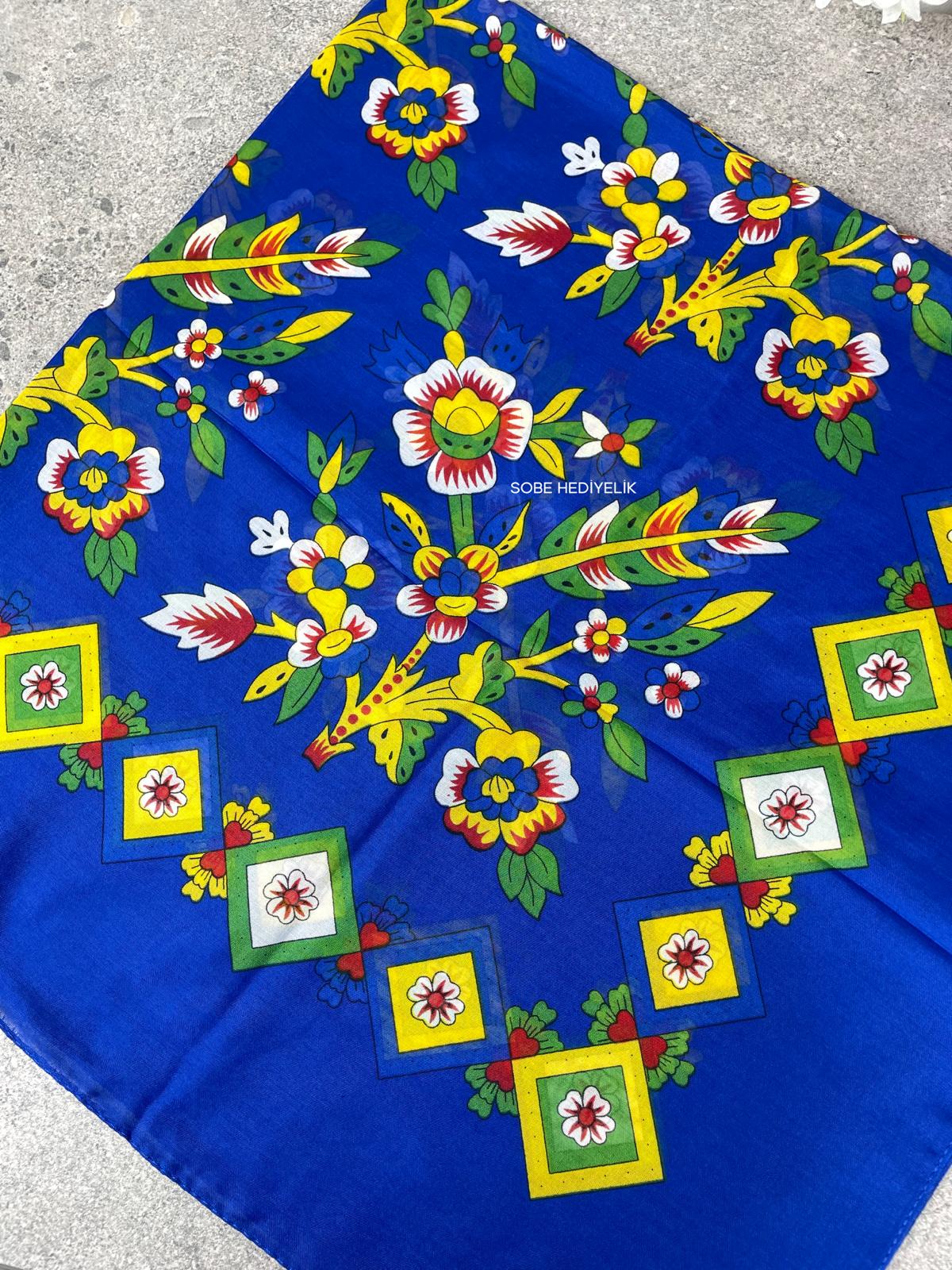 Mavi zemin üzerindeki Çengelköy çiçek ve kare motifleri ile canlı, yöresel ve modern bir görünüm sunar.