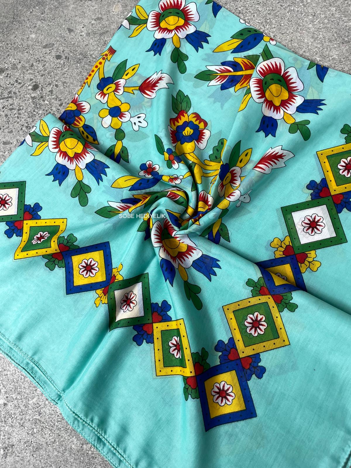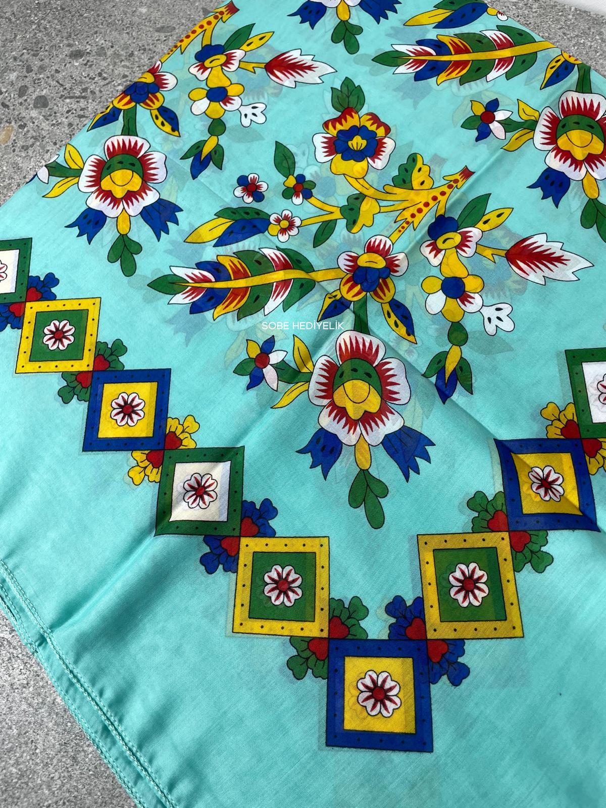 Su yeşili zemin üzerindeki Çengelköy çiçek ve kare motifleri ile canlı, yöresel ve modern bir görünüm sunar.
