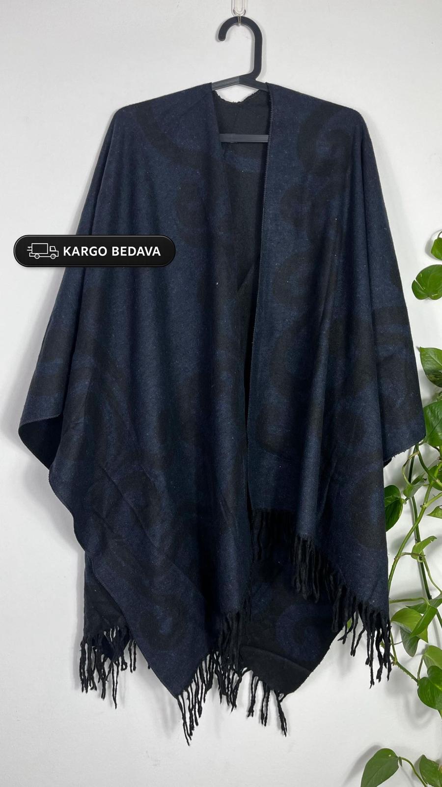 Çift Taraflı Yünlü Desenli Kadın Panço - Lacivert
