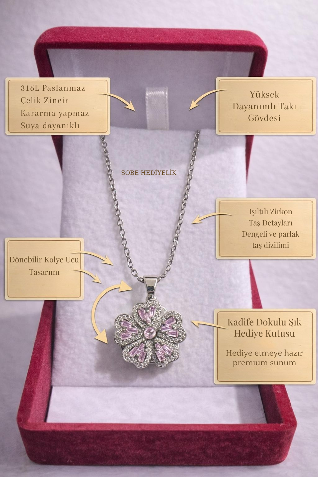 Dönebilir Çiçek Kolye – Kadife Hediye Kutulu