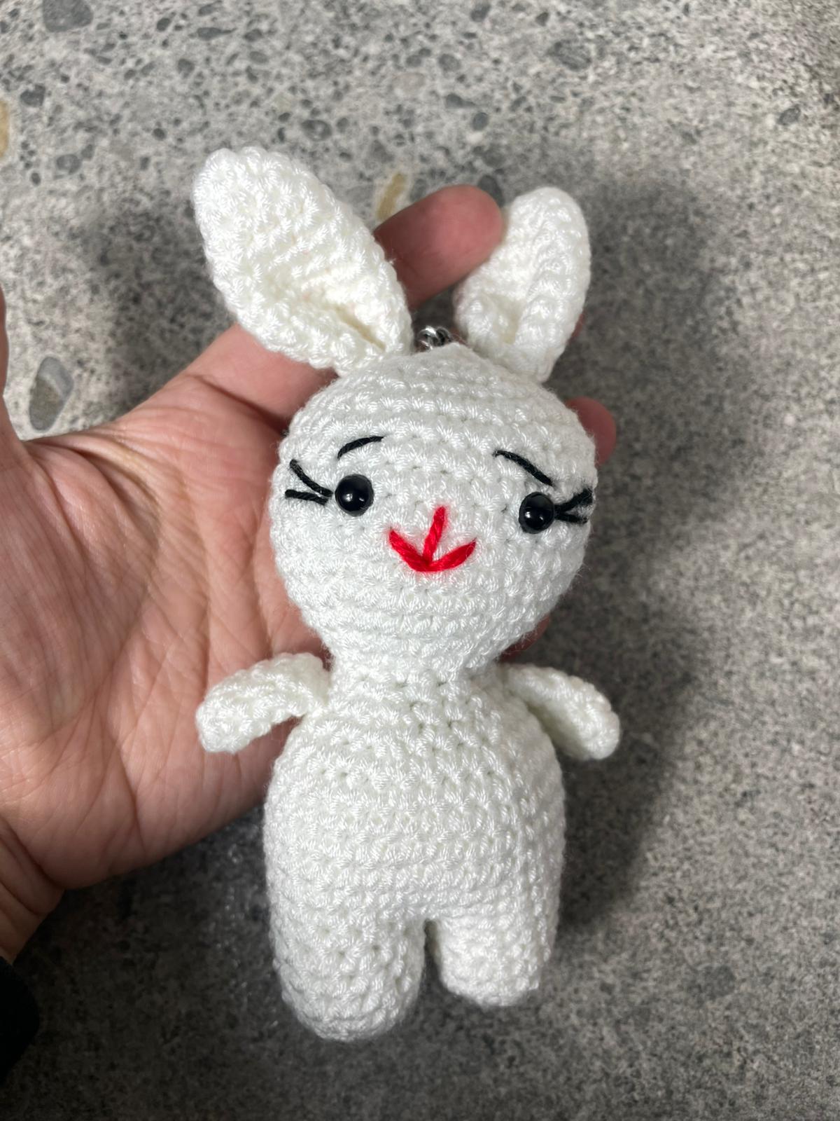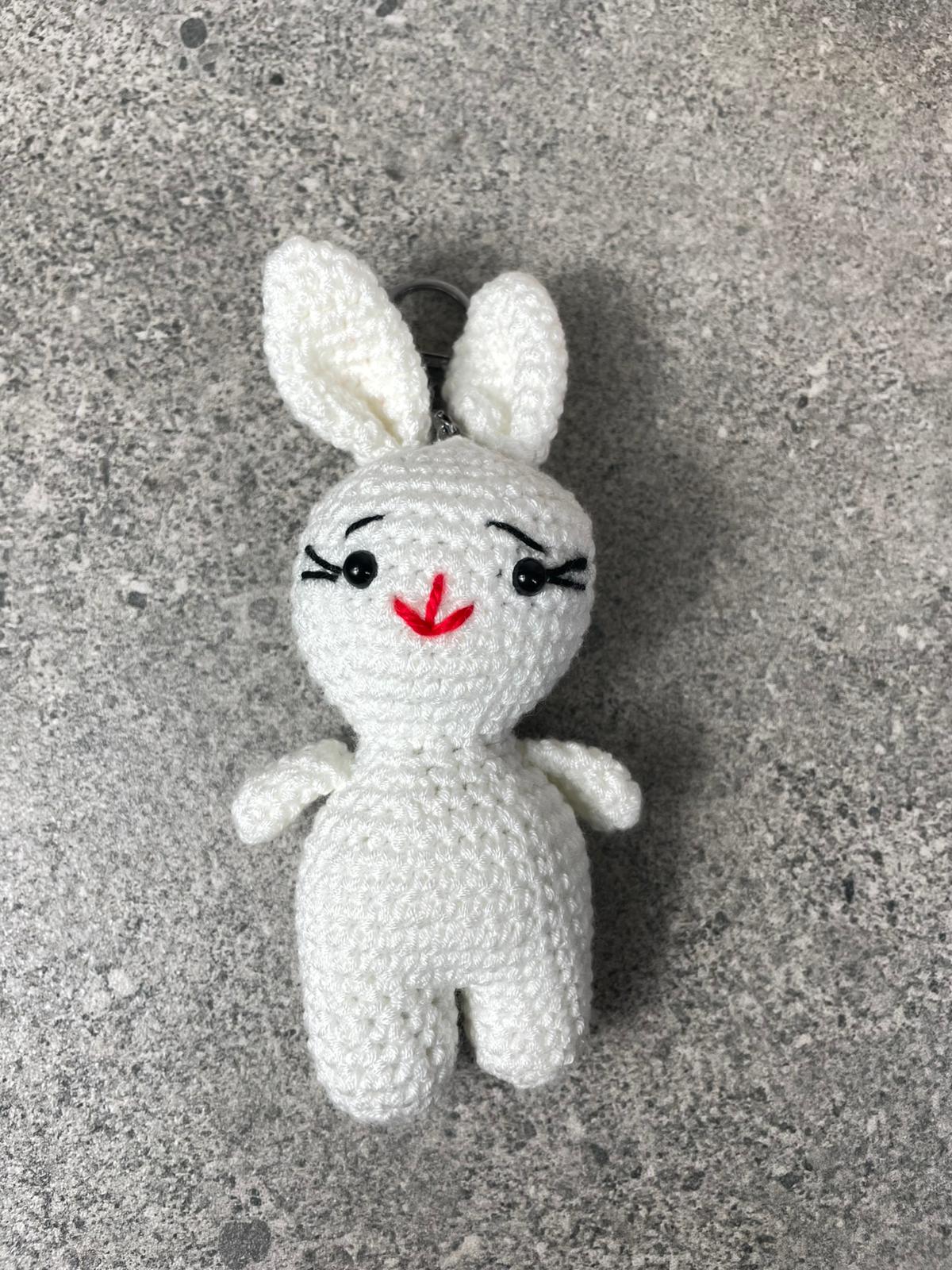 Tamamen elde örülmüş, kaliteli iplerle hazırlanmış sevimli tavşan anahtarlık