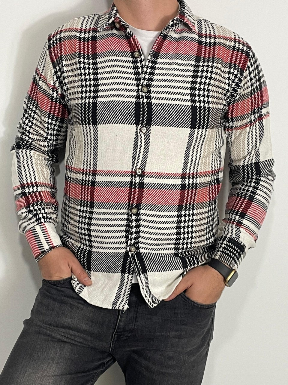 • Kırmızı–siyah–ekru tonlarda dikkat çekici ekose deseni ile modern bir görünüm.