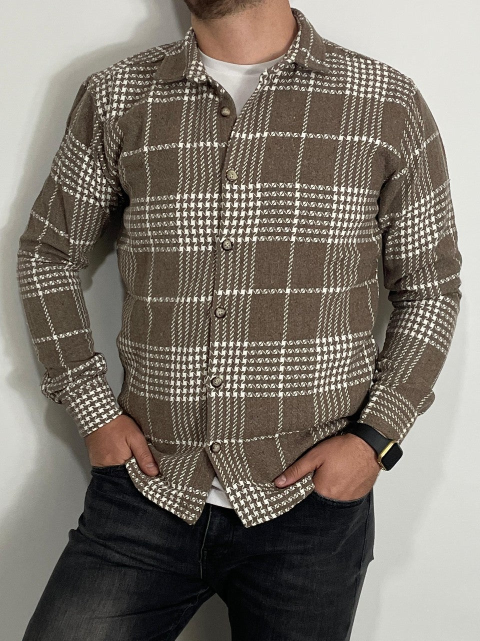 Kahve–beyaz ekose deseniyle şık, modern ve erkek giyime uygun tasarım.