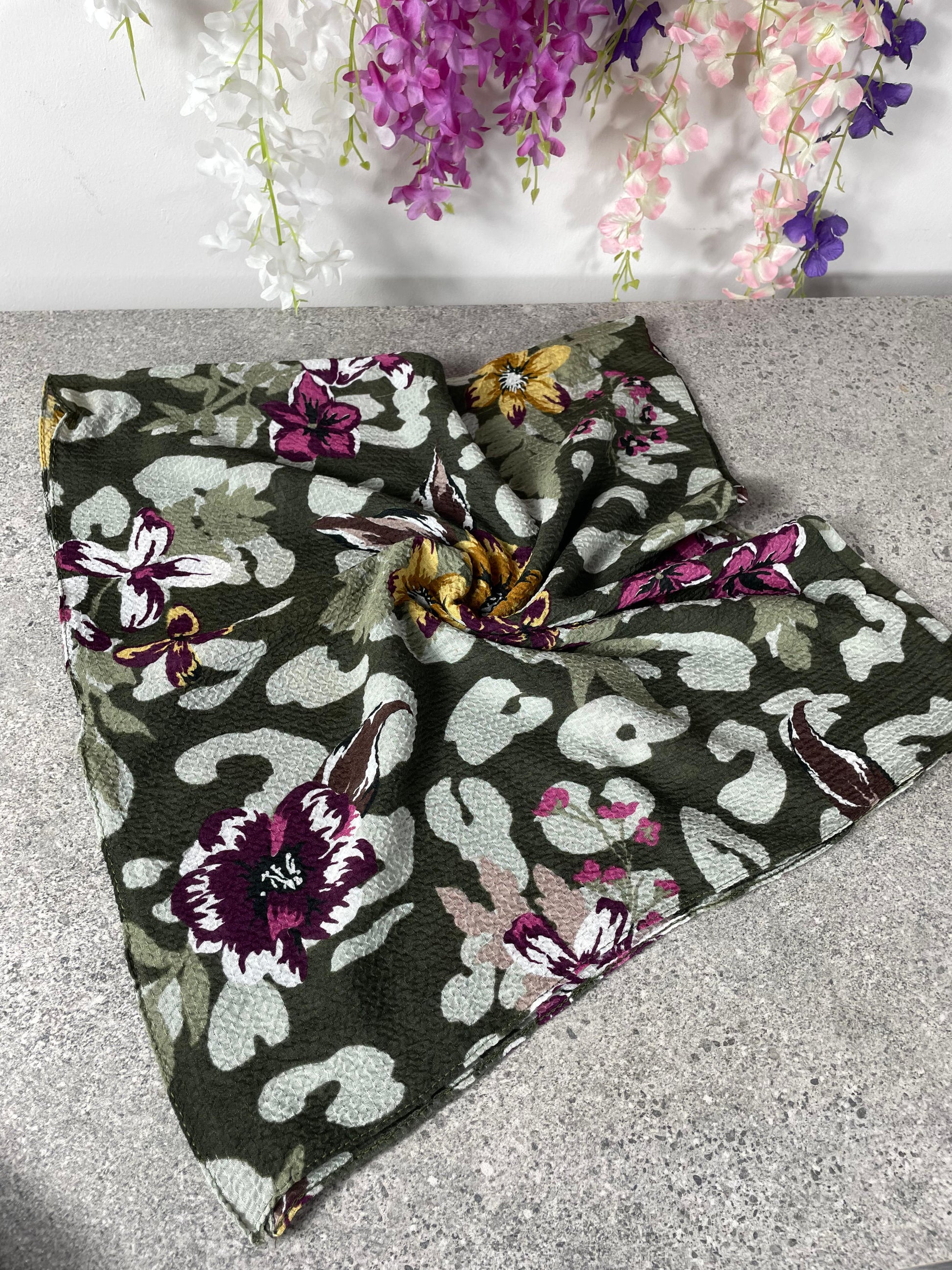 Haki zemin üzerindeki bordo ve sarı çiçek desenleri, modern ve canlı bir görünüm oluşturur.