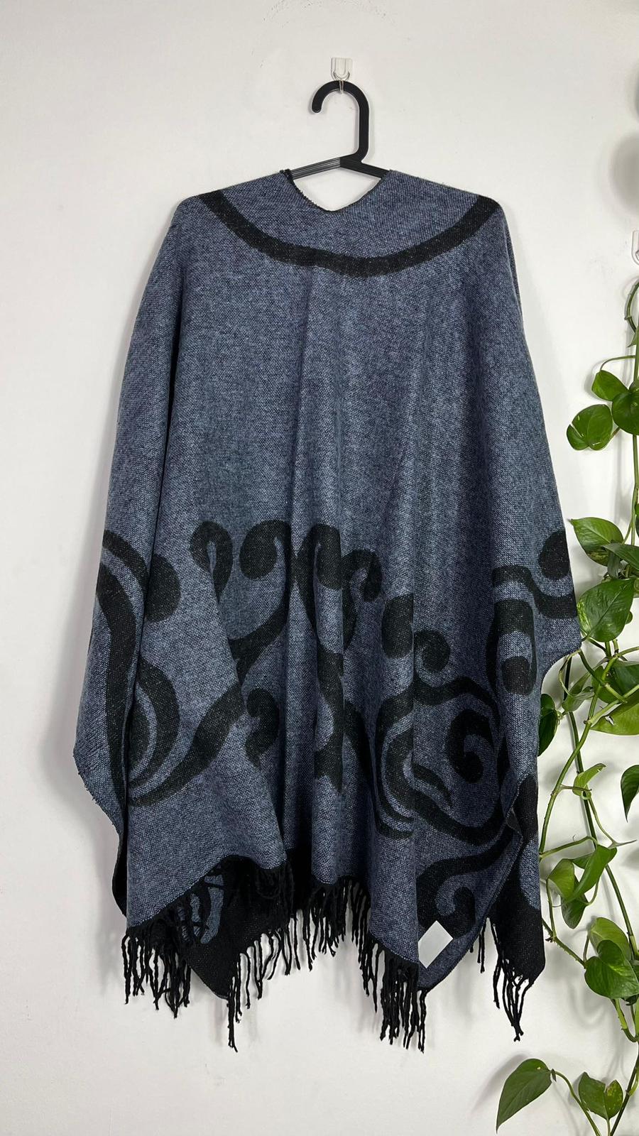 Indigo Mavi Çift Taraflı Yünlü Desenli Kadın Panço