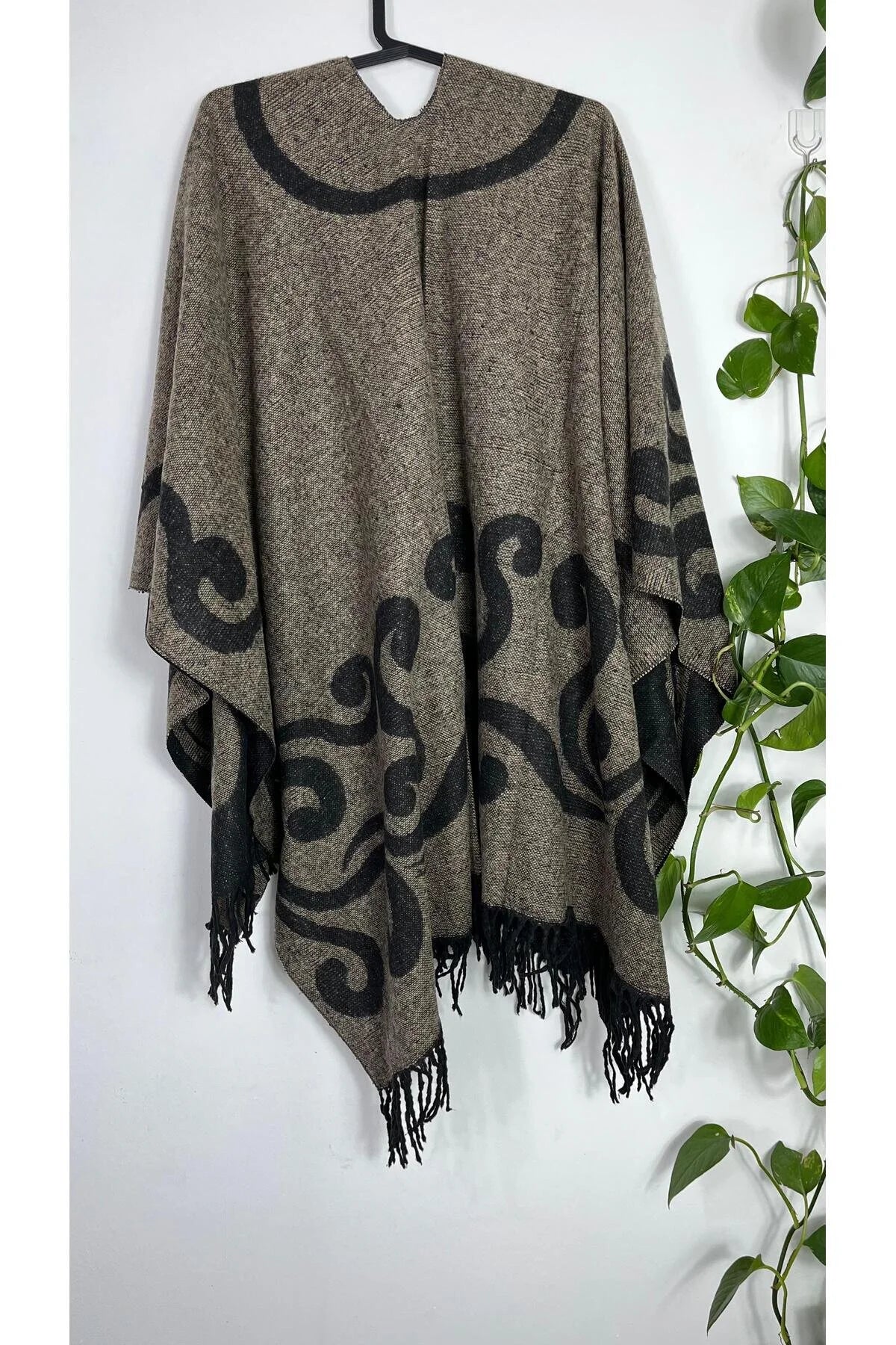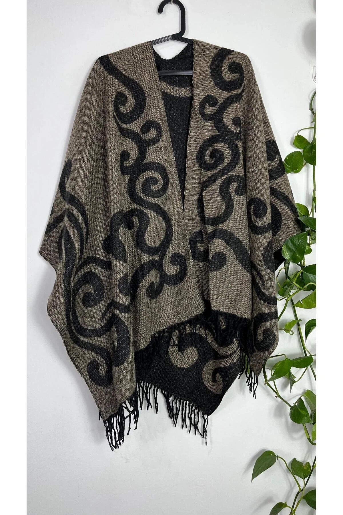 Kahverengi Çift Taraflı Yünlü Desenli Kadın Panço
