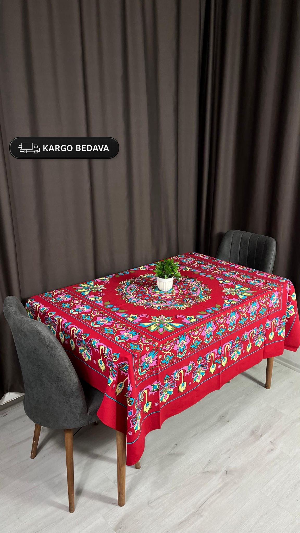Kırmızı Etnik Desenli 170x170 Kare Masa Örtüsü