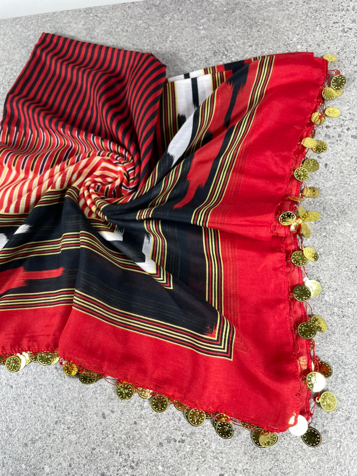 Kırmızı Siyah Desenli Pullu Yöresel Yazma – 100x100 cm | Karadeniz Modeli Çeyizlik & Günlük Başörtüsü