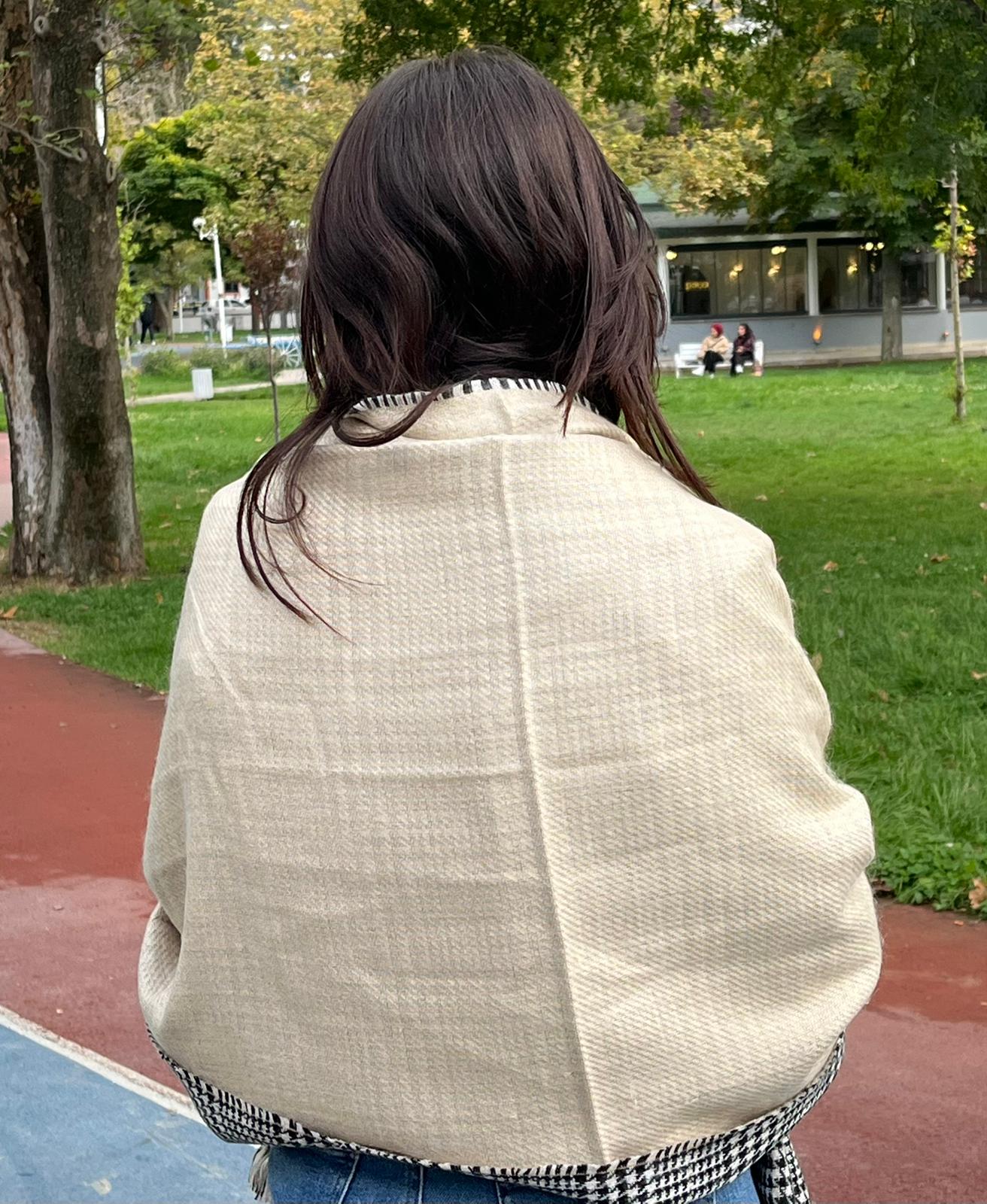 Kışlık Yünlü Çift Taraflı Ekose Şal - Krem
