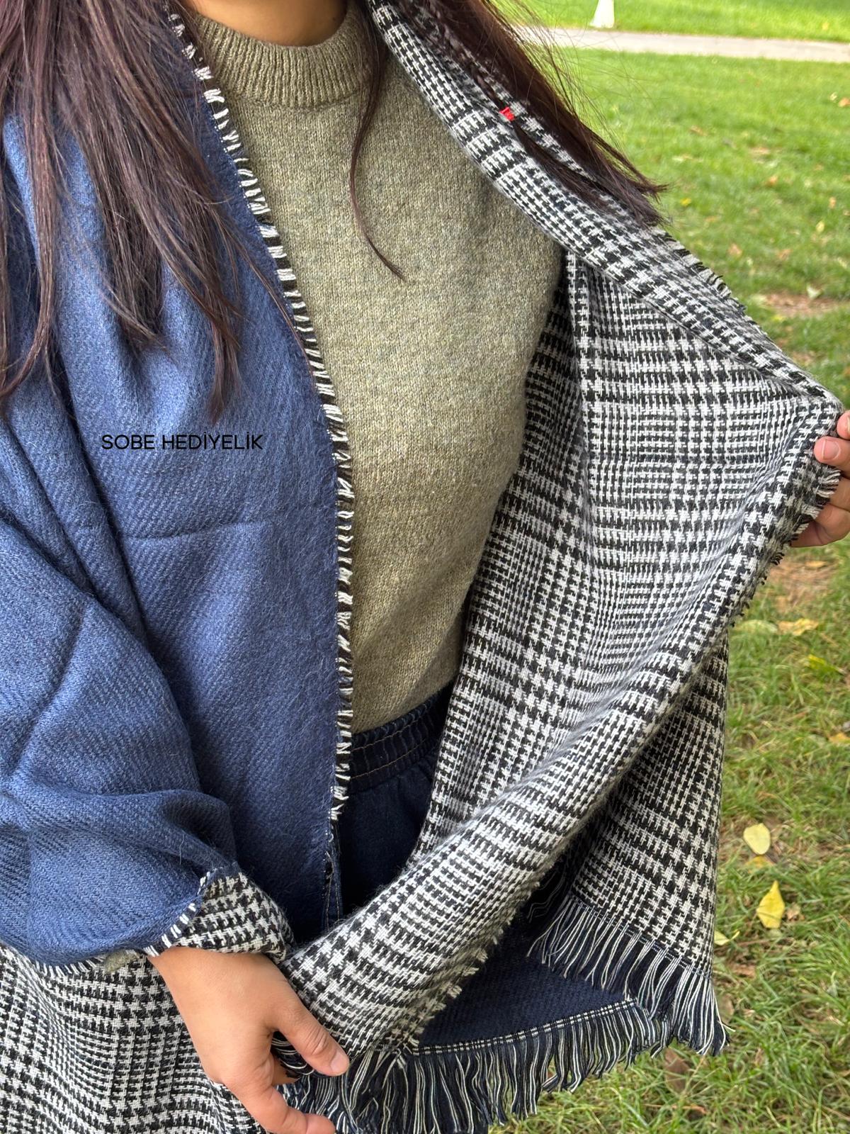 Kışlık Yünlü Çift Taraflı Ekose Şal - Mavi
