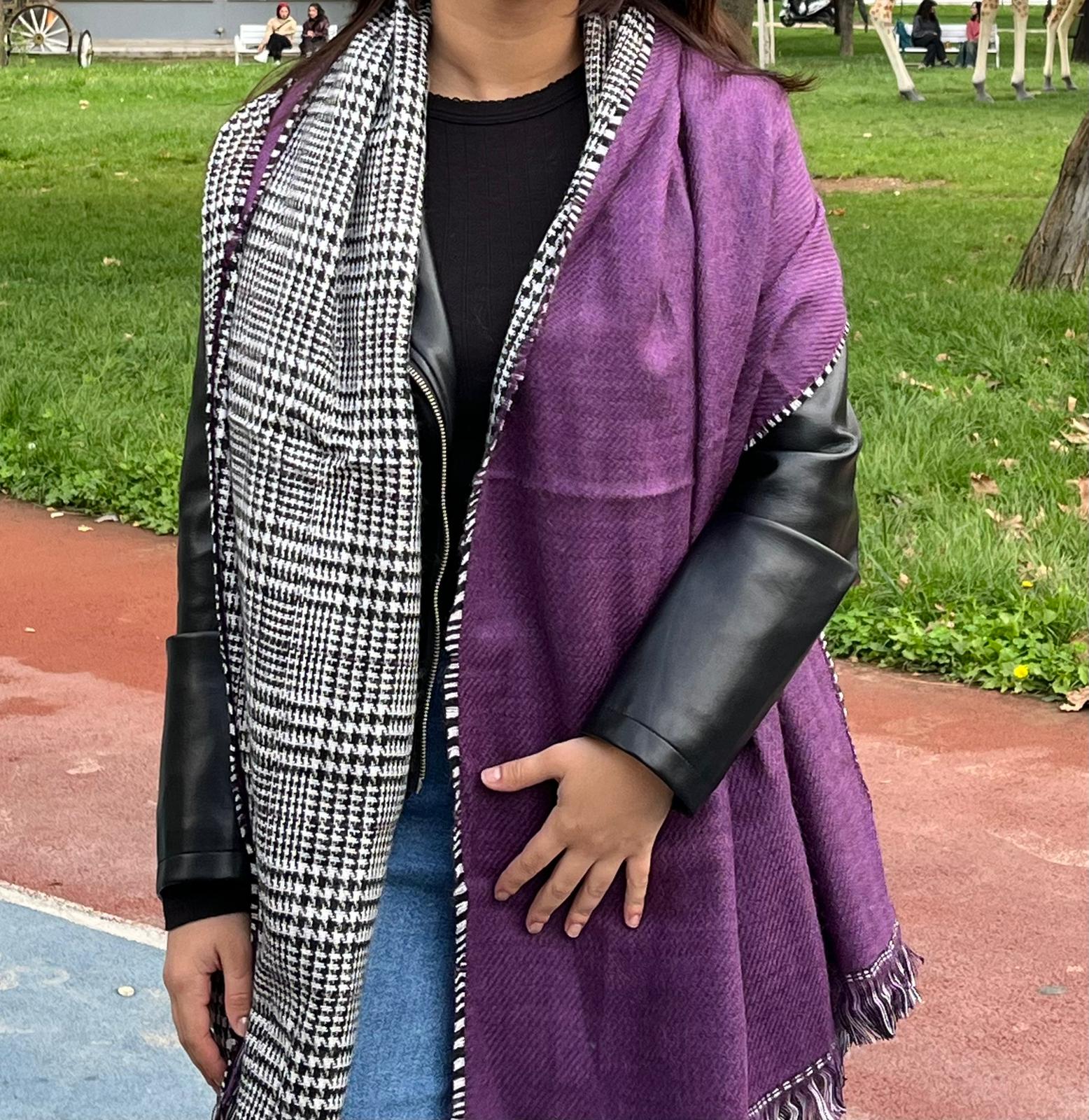 Kışlık Yünlü Çift Taraflı Ekose Şal - Mor