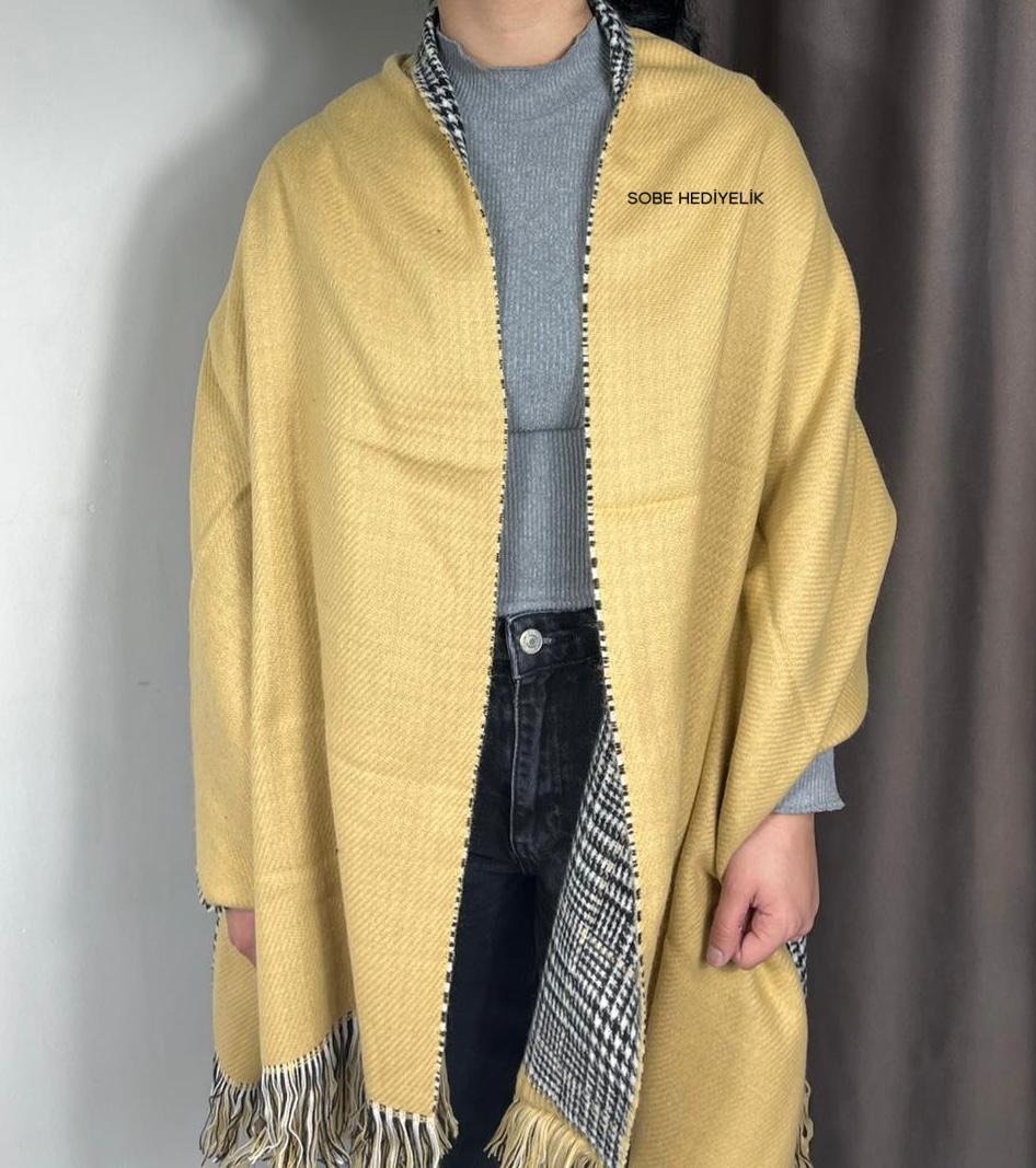 Kışlık Yünlü Çift Taraflı Ekose Şal - Sarı