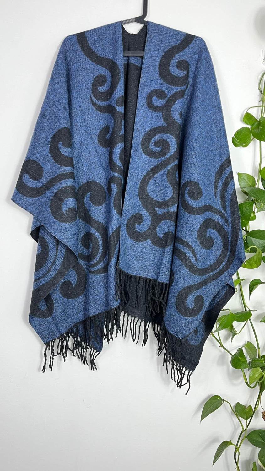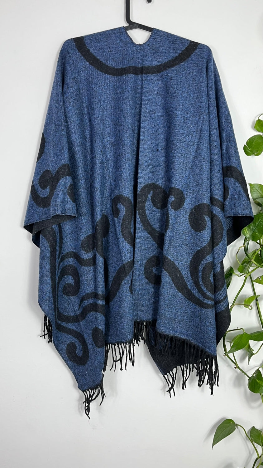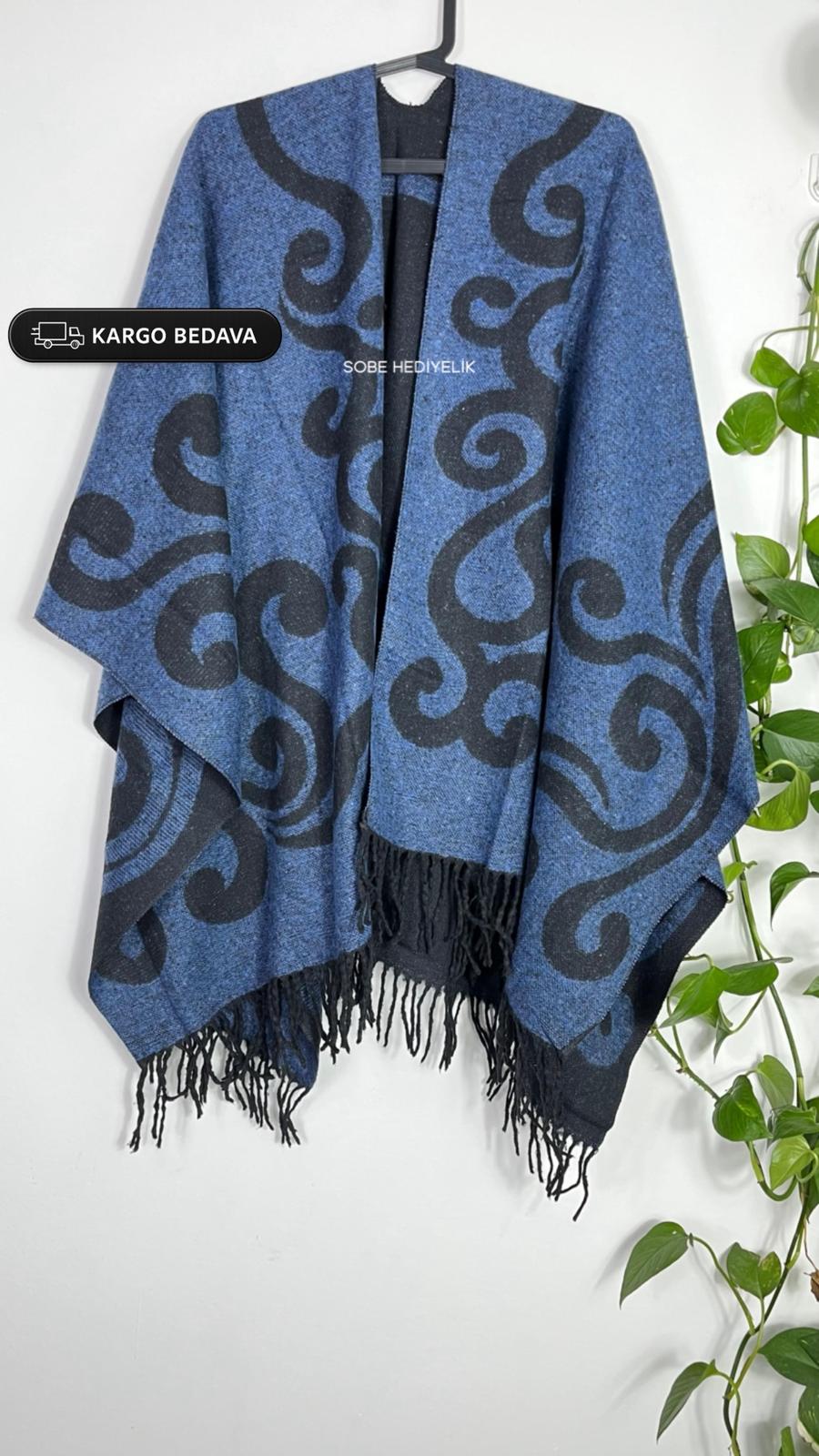 Mavi Çift Taraflı Yünlü Kadın Panço