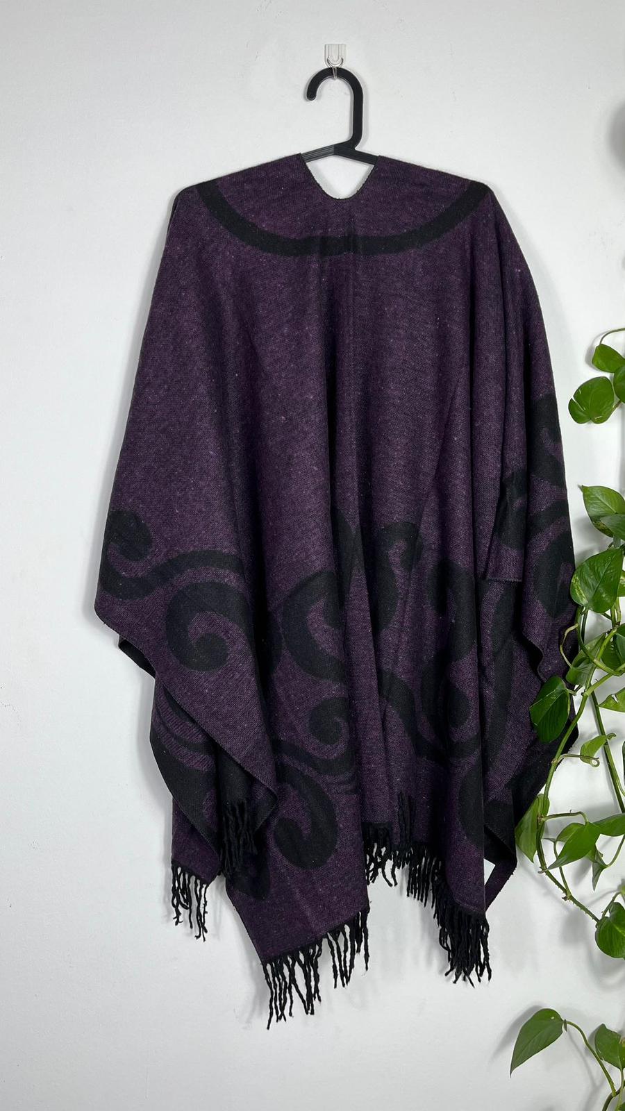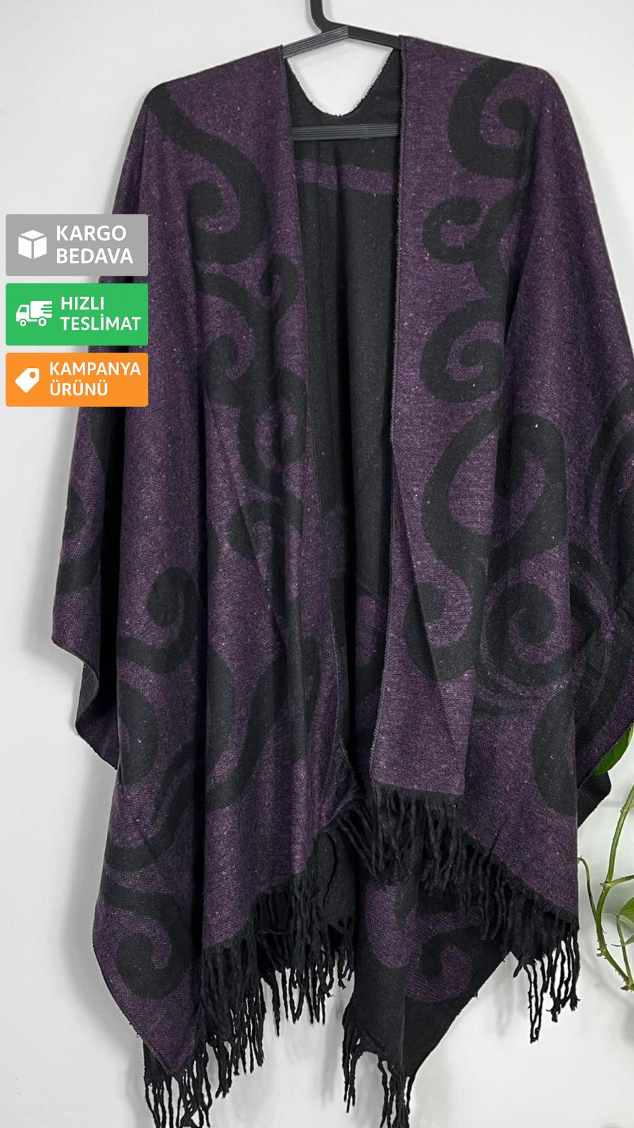 Mor Çift Taraflı Yünlü Desenli Kadın Panço