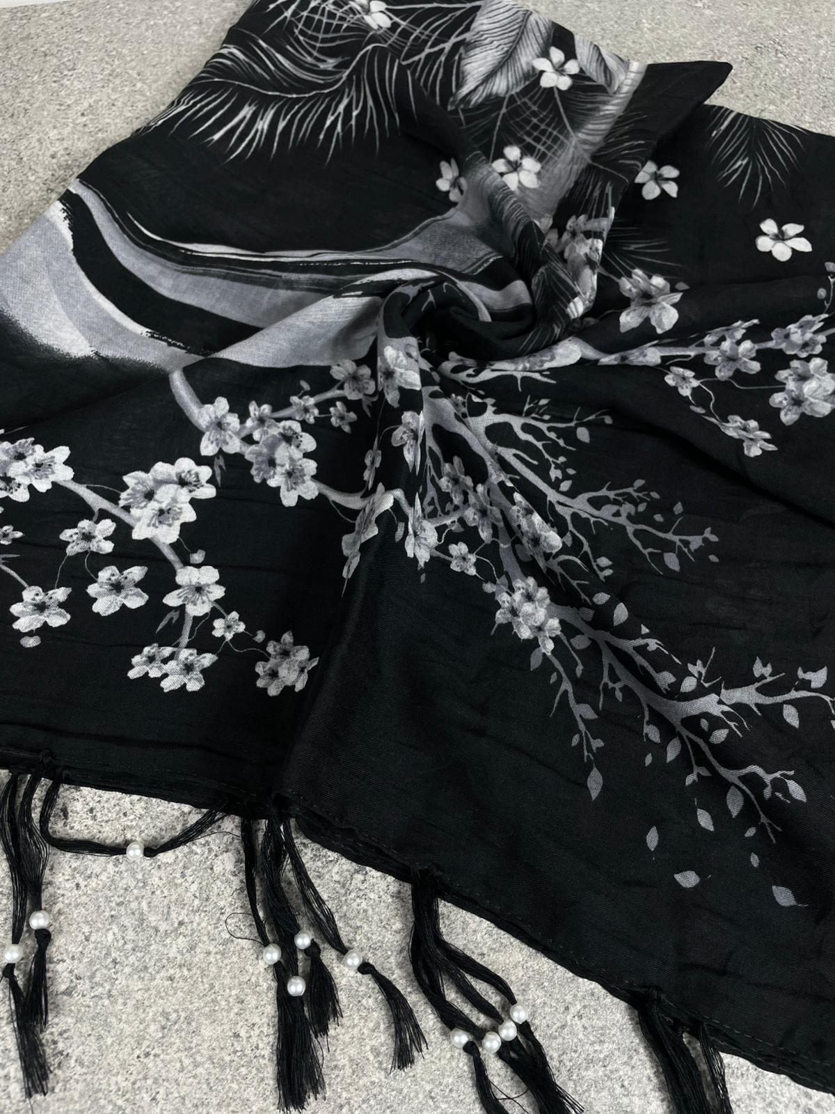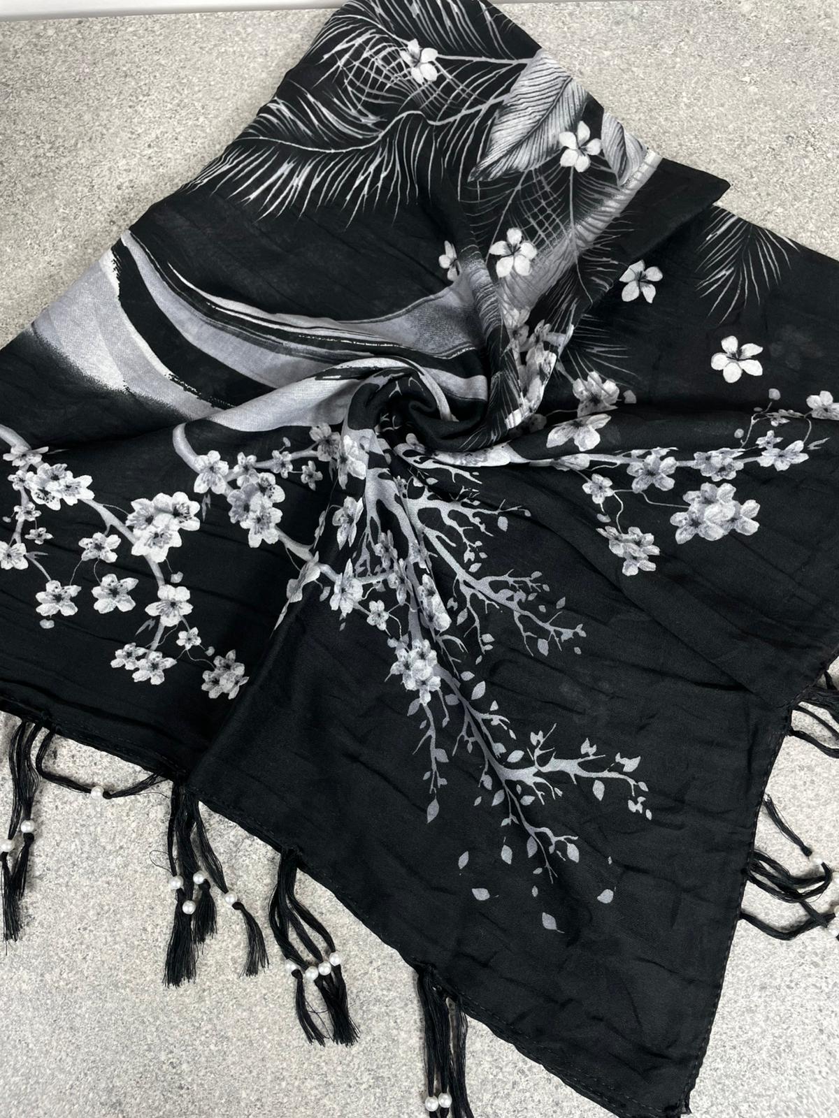 Siyah Gri Çiçek Desenli Pamuklu Yazma
