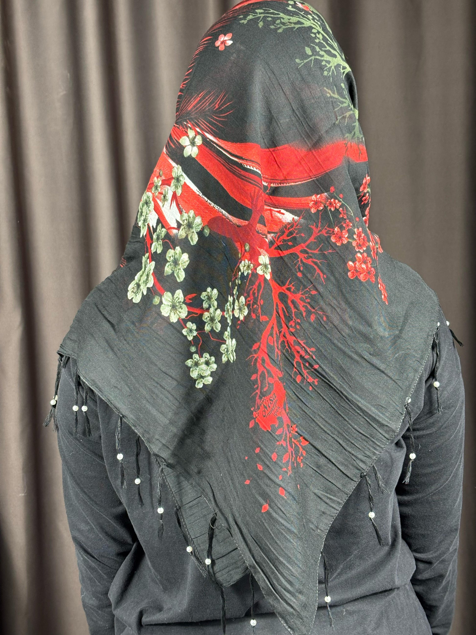 Siyah Kırmızı Çiçek Desenli Pamuklu Yazma