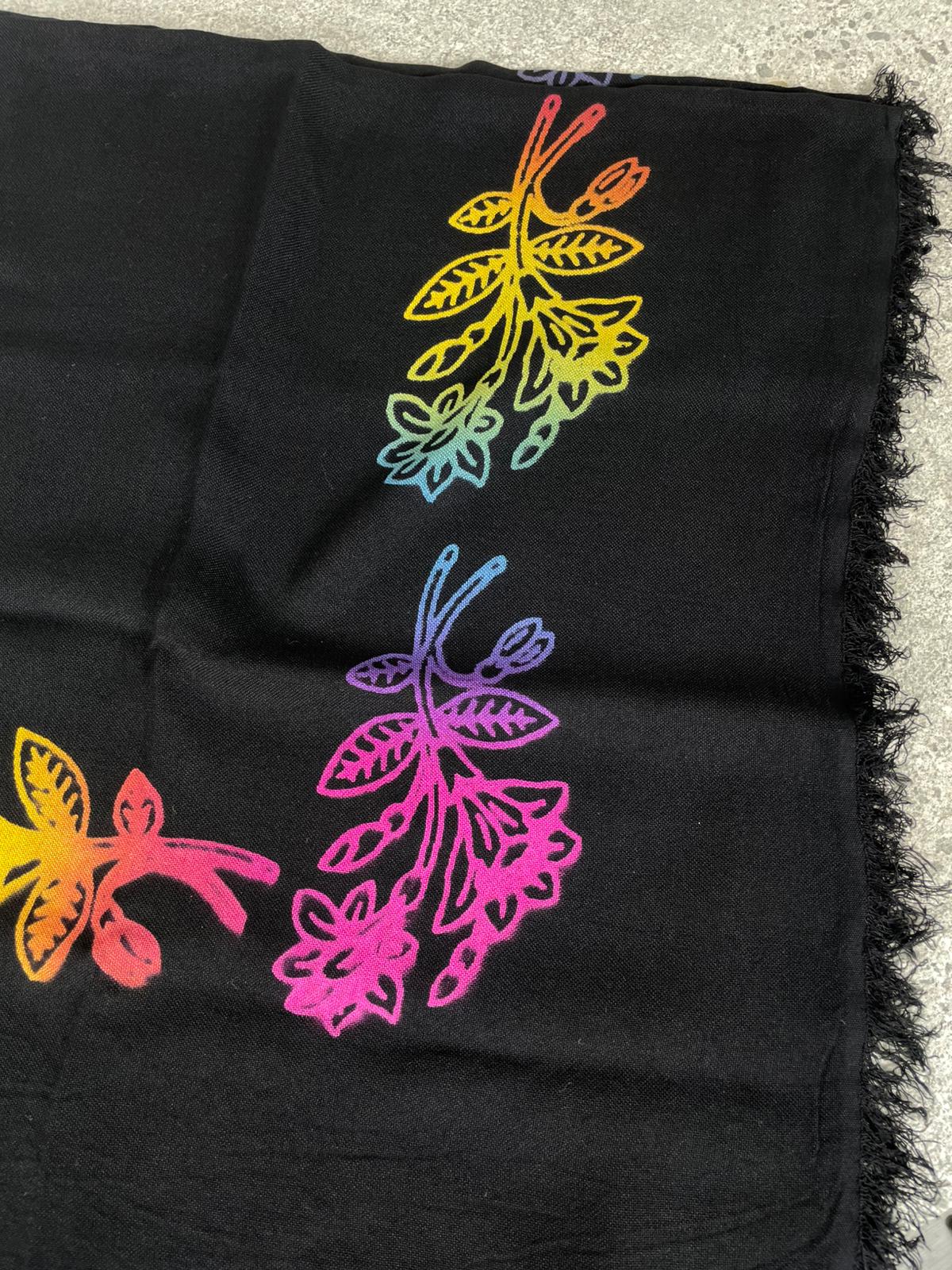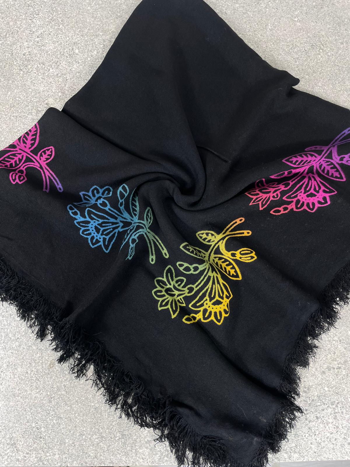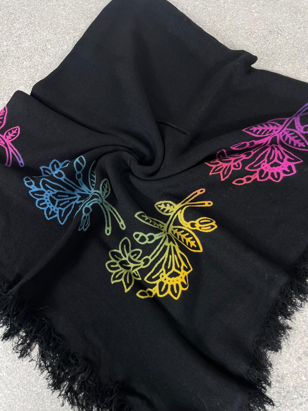 Siyah Renkli Çiçek Desenli Püsküllü Pamuklu Yazma