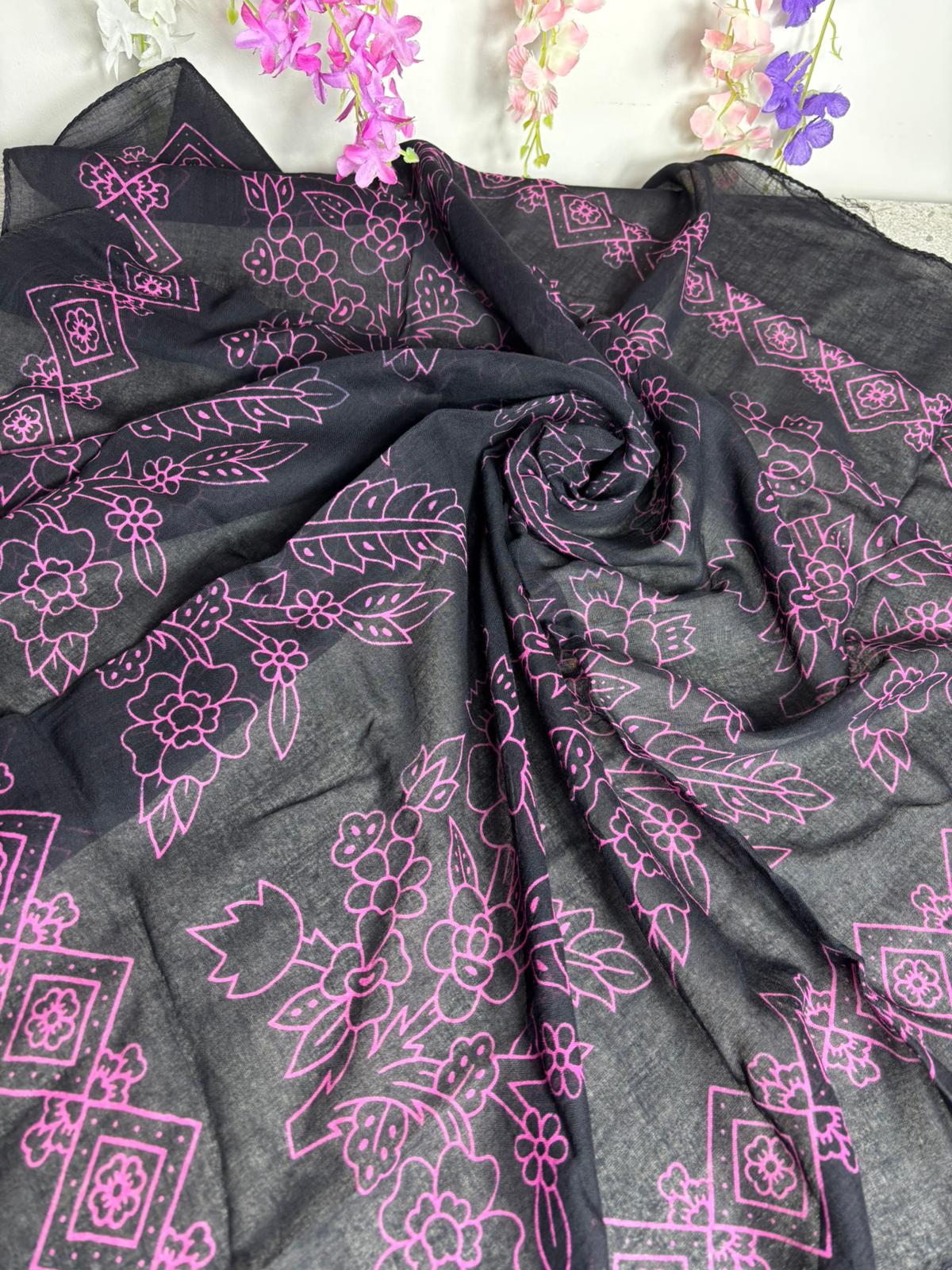 Siyah Zeminli Çiçek Desenli Tülbent Yazma