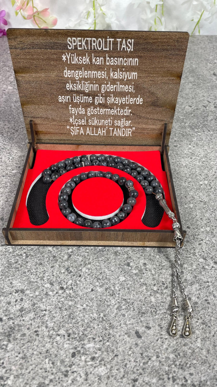 %100 doğal spektrolit taşından yapılmış özel tasarım 33’lük tesbih ve bileklik setidir.