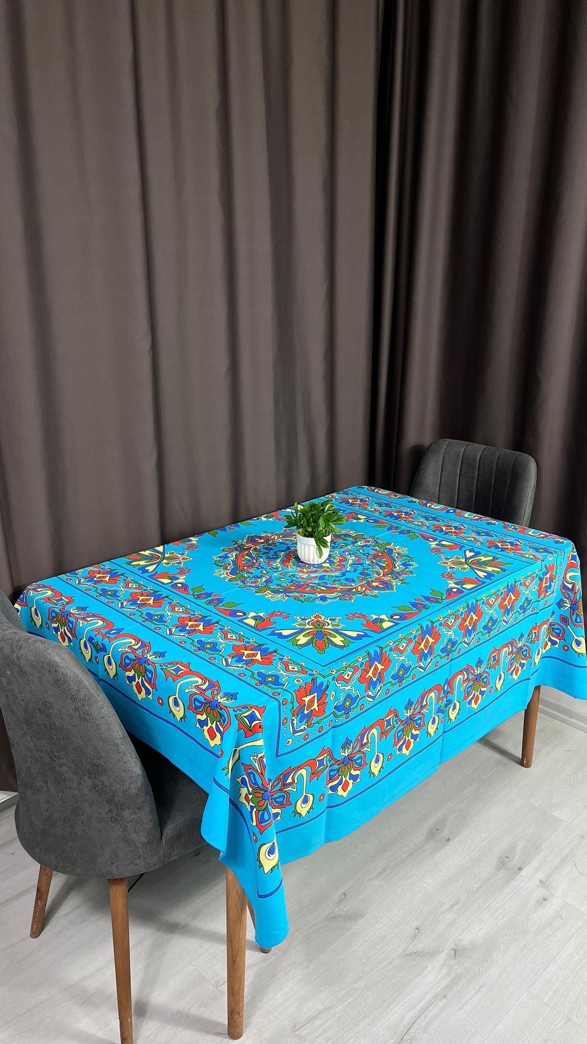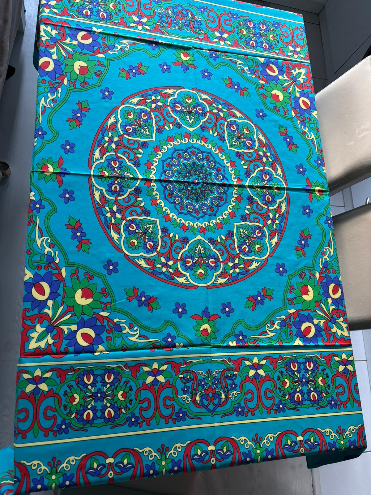 Turkuaz Etnik Desenli 170x170 Kare Masa Örtüsü – Canlı Renkli, Kolay Temizlenebilir Kumaş