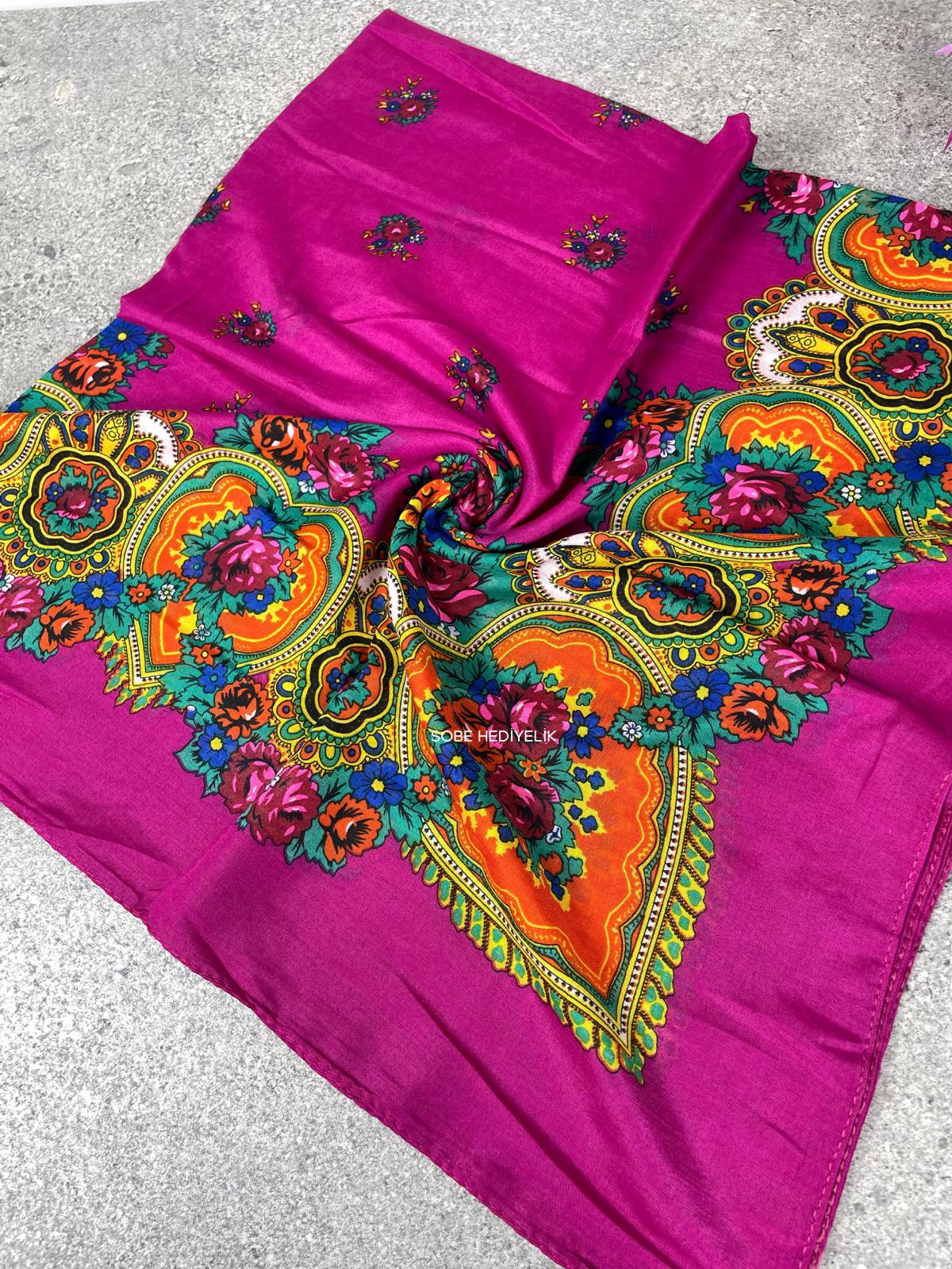 100x100 cm ölçüsüyle başörtüsü, fular veya aksesuar olarak kullanıma uygundur.