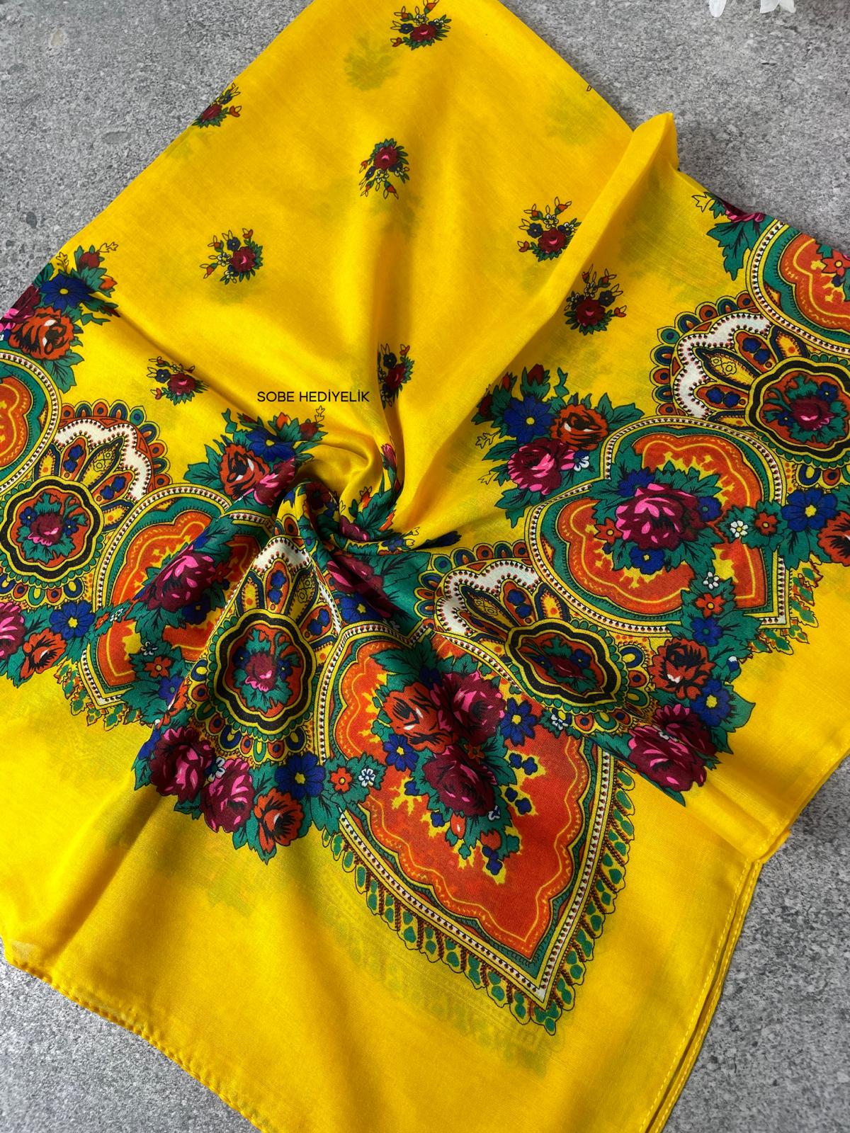 100x100 cm ölçüsüyle başörtüsü, fular veya aksesuar olarak kullanıma uygundur.